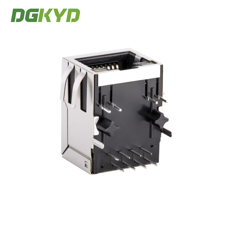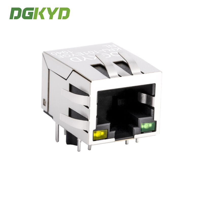 Гнездо разъема RJ45 с кристаллической головкой, встроенными светодиодными индикаторами и металлическим экранирующим кожухом. Номер детали KRJ-101EYGENL.